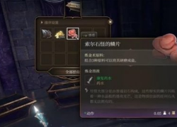 我们在游玩博德之门3游戏过程中,经常会出现找不到一些物品所在位置的情况,下面小编就为大家带来博德之门3索尔石怪的鳞片获取教程,感兴趣的玩家们可以来了解一下,希望能帮到大家