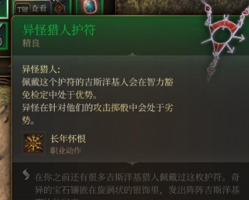 3、此装备品质为精良品质,佩戴后可以获得buff异怪猎人,佩戴这个护符的养鸡人可以在智力豁免获得优势,异怪针对他们攻击的时候会处于劣势。
