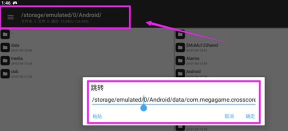 3、点击上面的地址栏,进入跳转窗口,输入/storage/emulated/0/Android/data/com.megagame.crosscore/files/Custom/并进入。