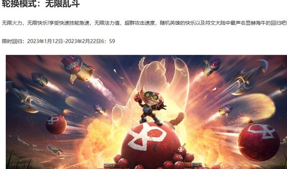 英雄联盟无限火力什么时候开启?在英雄联盟的轮换模式中,最受欢迎的应该就是无限火力模式了,不过很多玩家还不知道今年的无限火力应该什么时候开始,下面小编就为大家带来英雄联盟无限火力时间2024