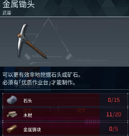 2、金属锄头可以更有效率的挖掘石头或矿石,必须使用优质作业台才可制作。