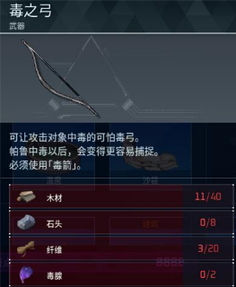 3、制作材料需要40个木材、8个石头、20个纤维、2个毒腺。