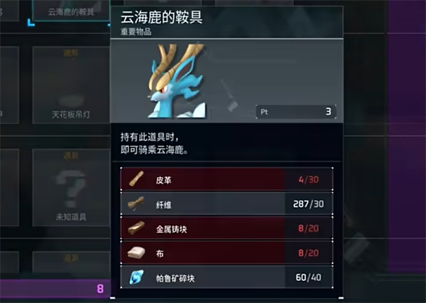 3、制作材料30皮革、30纤维、20铸块、20布、40个帕鲁矿碎块。