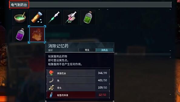 4、制作消除记忆药需要99个美丽花朵、50个角、50个骨头、50个帕鲁的粘液。