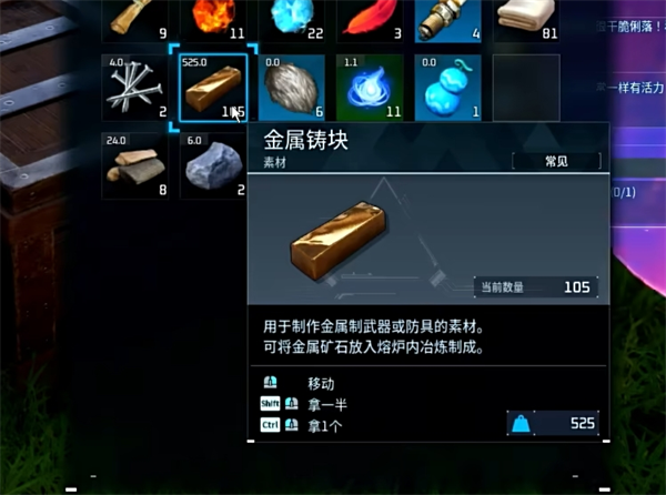 1、在游戏中,金属铸块是非常重要的材料,可以制作物品,制作建筑等,要想获得金属铸块就需要先获得金属矿石。