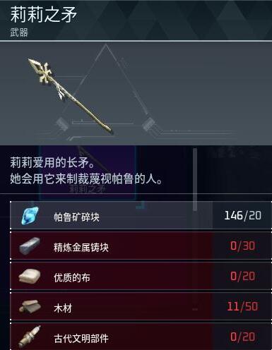 2、材料需要准备20个帕鲁矿碎块、30个精炼金属铸块、20个优质的布、20个古代文明部件。