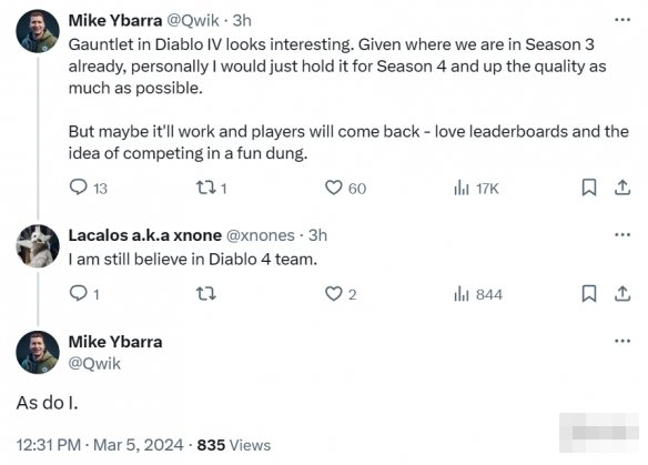 《暗黑破坏神4》「试炼场」(Gauntlet)将在3月6日更新,暴雪游戏前任总裁Mike Ybarra今日发文表示《暗黑4》的「试炼场」玩法看起来很有趣,他个人感觉可以把这个玩法保留到第四赛季并提高质量,也许这会让玩家们回归。评论区中有玩家表示他依然相信《暗黑4》的开发团队,Mike Ybarra也认同他的说法。