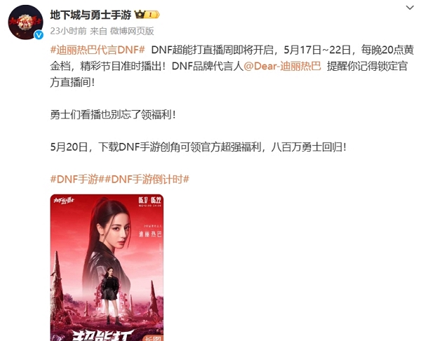 dnf手游官宣代言人 5月20日创角下载领超多福利。dnf手游即将公测,官方在不久前正式公布了相关代言人,代言人为迪丽热巴。玩家可在公测前一天进入游戏创建角色,可提前领取官方超多奖励。
