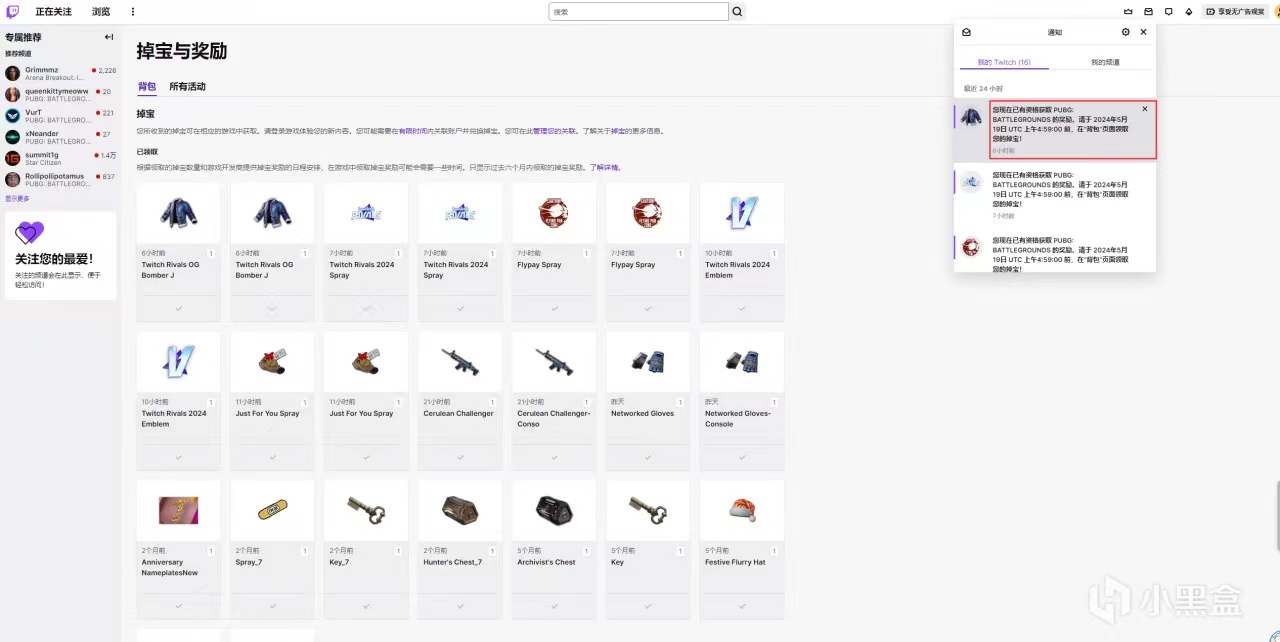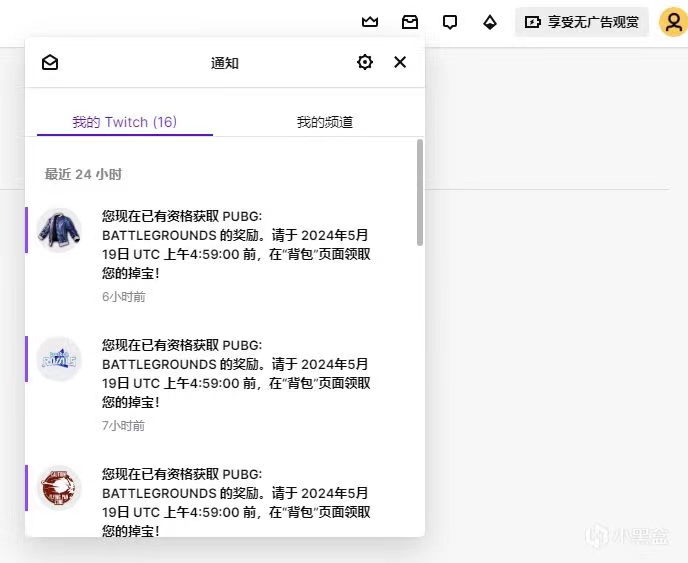 上面两个截图是我自己掉宝账户挂机收到的私信,提示2024年5月19日 UTC 上午4:59:00之前领取,这个时间换算成北京时间就是 2024年5月19日下午12:59:00之前,twitch掉宝挂完了是有个【立即领取】按钮的,如果在指定的时间没有点击这个按钮,这个就无效了。