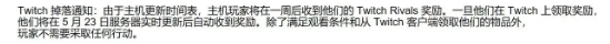 最早活动时间是5点到10点,然后官方又进行了延迟,掉宝时间被延迟到下午1点,所以这里基本出现没到帐的都是在10点以后领取的,10点之前都是秒到账,推测应该是twitch那边修改时间活动配置没有同步漏掉问题导致没有正常到账。