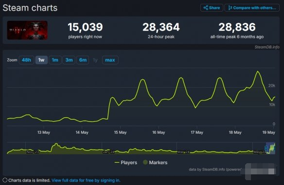 《暗黑破坏神4》第四赛季“寻宝重生”已经上线,根据SteamDB的统计,自5月15日上线之后,该作的玩家在线率激升。
