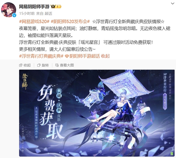 不久前的网易520发布会发布了多款游戏的相关咨询,阴阳师则是发布了有关于浮世青行灯典藏皮肤的最新消息。