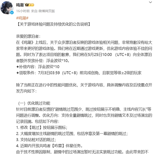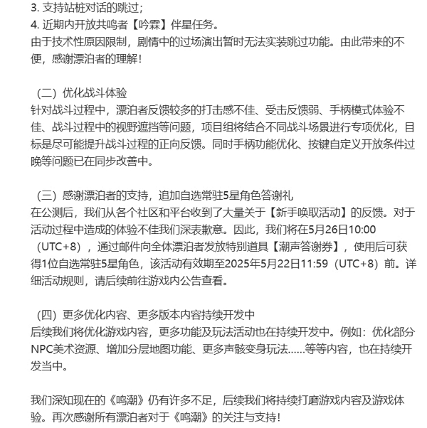鸣潮再发致歉公告 多样功能优化实装中。继5月24日凌晨发布相关致歉公告后,玩家仍旧颇为不满,24日晚,鸣潮再度发布致歉公告,并送上丰厚补偿与安抚承诺。