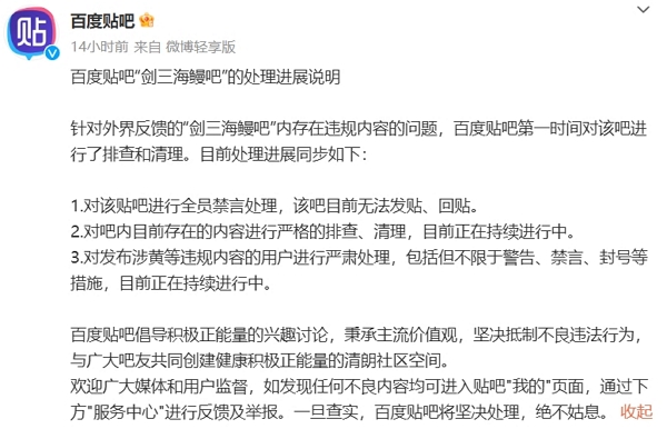 目前百度贴吧已经对相关贴吧进行禁言等等处理,但剑网三并不希望就此止步,剑网三希望可以永久关闭该贴吧,此后百度贴吧暂未回应。