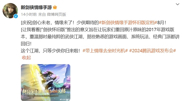 不久前2024腾讯游戏发布会结束,发布会上揭露了有关于新剑侠情缘手游怀旧版的定档消息,新剑侠情缘手游怀旧版将在8月进行正式上线,目测在不久后还会有更多放出。