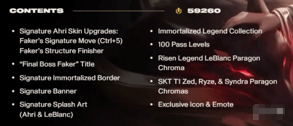 据了解,本次皮肤售卖共有三个档次,分别为5430 RP(约40美元 300元人民币)、32430 RP(约250美元 1800元人民币),最高档更是贵达59260 RP(约450美元 3200元人民币),其中包含通行证、多款限定纪念道具,例如英雄击杀特效、防御塔击杀特效、定制播报、皮肤形态切换、游戏内Ctrl+5的Faker招牌动作、“Final Boss Faker”头衔等等。