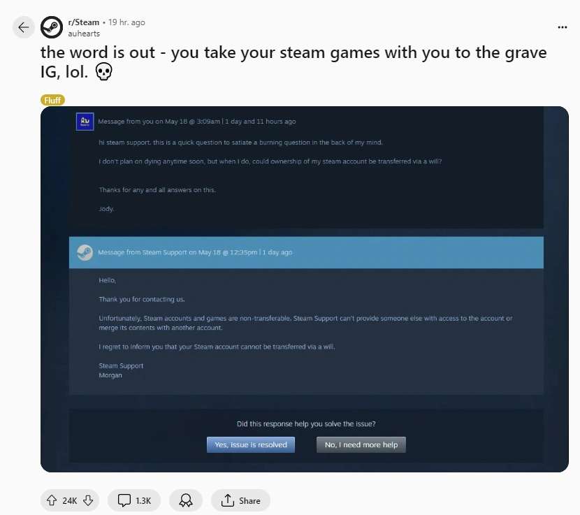 CDPR和GOG商店明确表示,用户有权继承已故亲属的账号,但需要提供官方文件,证明用户已成为合法继承人,且死者确实将账号和游戏库存遗赠给了他。