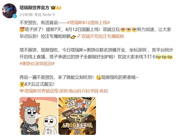 塔瑞斯也忽然宣布游戏将于6月12日提前上线。6月12日,即魔兽世界国服的回归技术性测试的第二天。