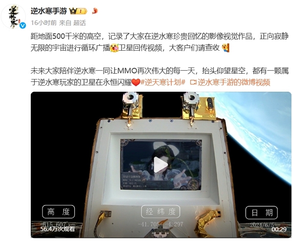 本次卫星所在距离地面约500千米,此时此刻,或许那些属于逆水寒手游与逆水寒手游玩家的回忆正在宇宙熠熠生辉。