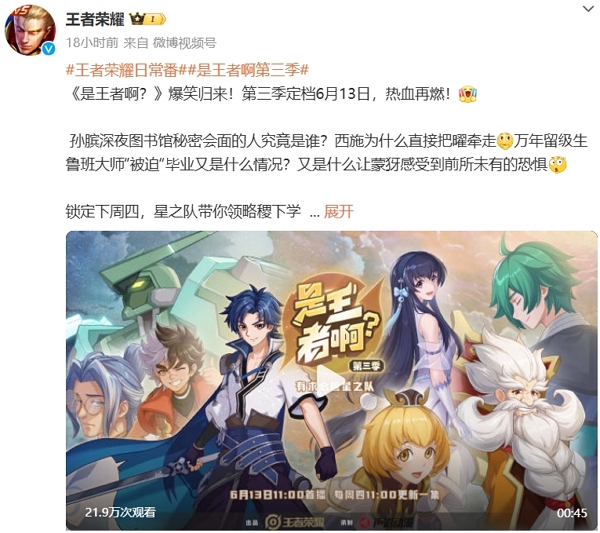 最新消息,王者荣耀宣布王者荣耀衍生动漫是王者啊第三季定档6月13日。本季将讲述星之队的有关场景互动。