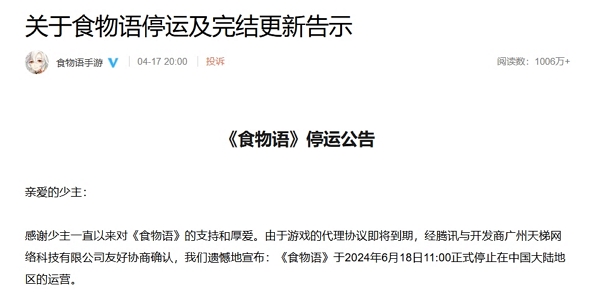 2024年4月,食物语宣布因流水等等问题将于6月18日11:00正式停止在中国大陆地区的运营。但会出现食物语陪伴版,不继承现有数据的陪伴玩家。消息一出,玩家并不买账,进行大范围维权,指控食物语为恶意关服而删除各类氪金点,要求食物语保留数据留存单机版,相关维权信息多次冲上微博热搜,未果。