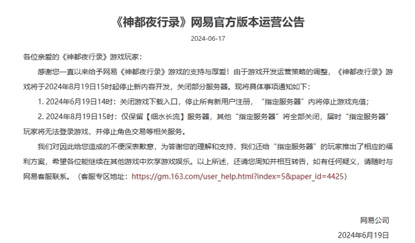 网易神都夜行录宣布停止运营 仅保留单个服务器。网易的妖怪类rpg手游神都夜行录宣布在今日宣布停止更新,并关闭部分服务器,仅保留细水长流服务器。