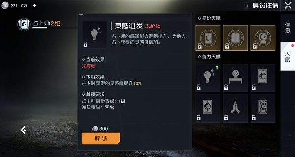 通过解锁和提升身份天赋“灵感迸发”,可以提升占卜师的感知能力,为他人占卜时获得的灵感值将会增加。