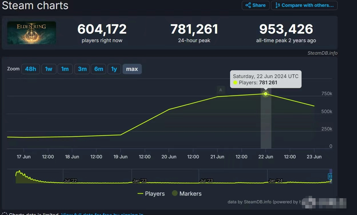 《艾尔登法环》DLC“黄金树幽影”近日正式上线,迎来周末热潮,玩家热情高涨。根据SteamDB数据显示,《艾尔登法环》在Steam上的在线人数峰值昨日达到781,261人。
