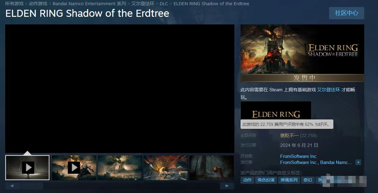 “黄金树幽影”在首发时获得了「好评如潮」的评价,但随后Steam上的玩家评价逐渐下滑。截至目前,该DLC的总评价为「褒贬不一」,用户好评率为62%。