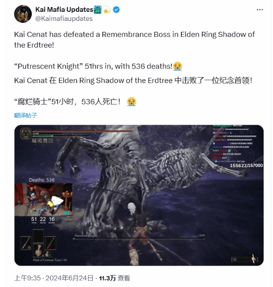 最近老鼠台知名主播Kai Cenat用最快的速度推进老头环新dlc黄金树幽影,在51个小时的游戏时间里,经历了536次死亡,击败了融泥骑士,正接近最终的boss前进。