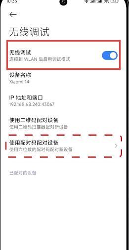 7、进入无限调试开关之后,打开开关,选择下面的使用配对码配对设备。
