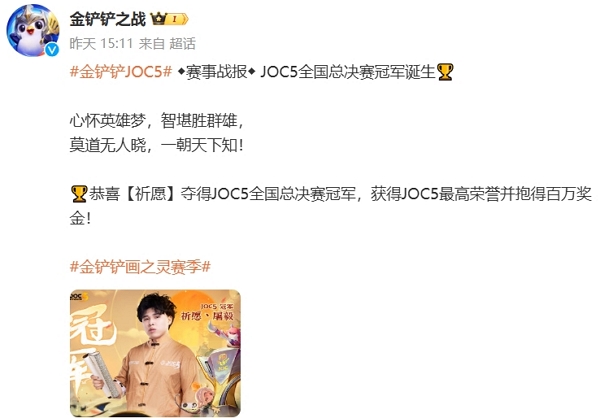 2024金铲铲之战joc5在不久前正式结束,选手祈愿过关斩将,获得了joc5全国总决赛冠军的宝座。