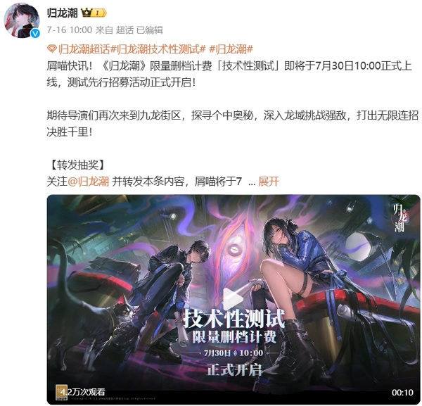 本次归龙潮测试类型为限量删档计费技术性测试,相关测试将会在7月30日10:00开启。