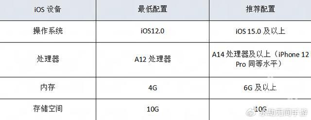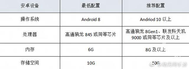 推荐配置高通骁龙 8 Gen 1、联发科天玑 9000 或同等芯片以上,8GB 内存、10GB 存储空间。