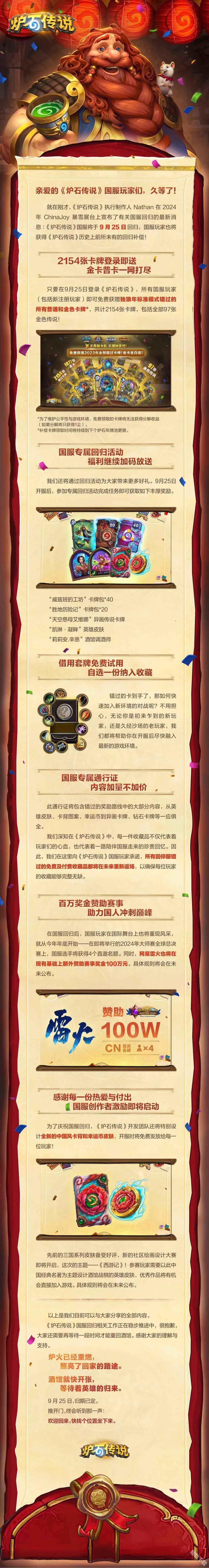 就在2024chinajoy(cj)展会上炉石传说的制作人宣布该游戏在9月25日正式回归。炉石与2023年1月24日0时停止运营,并被杭州亚运会电竞移除比赛项目后,也是将炉石传说国服消失一年多后正式回归。