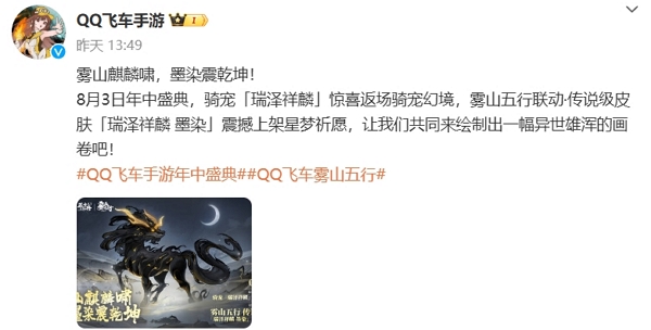 8月3日qq飞车手游将开启年中盛典,骑宠[瑞泽祥麟]将返场骑宠幻境。
