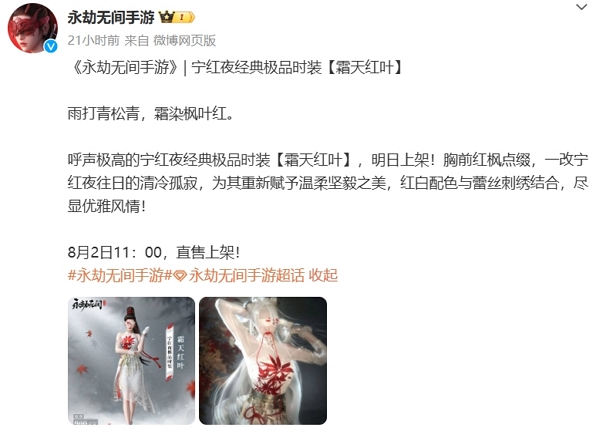 永劫无间手游宁红夜经典极品时装霜天红叶今日上线。拥有超高人气的宁红夜经典极品时装霜天红叶在今日正式上线,玩家可前往游戏商城当中进行直售获得。