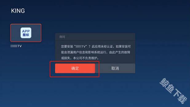 6、会有询问的内容提示【您要安装XX TV?此应用未经认证,如果安装可能会泄漏用户信息和影响系统运行,由此产生的故障或损失,本公司不负责维护。】这时候点击【确定】,可以成功安装并打开