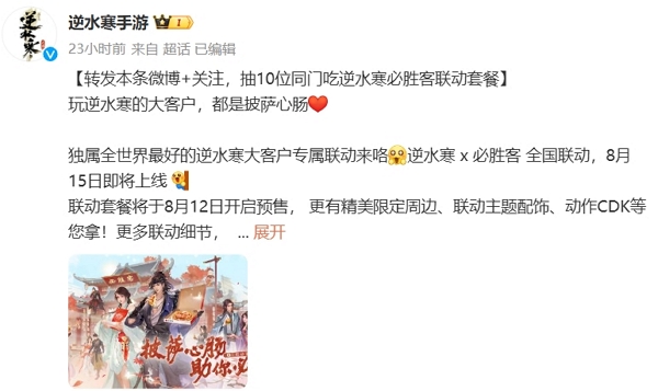 逆水寒手游在不久前正式宣布与必胜客的联动消息,活动将会在8月中旬正式开启,玩家参与活动有机会获得限定周边。