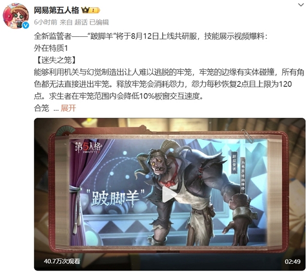第五人格在不久前公布公布了全新监管者跛脚羊的相关技能,该角色将在不久后上线共研服。