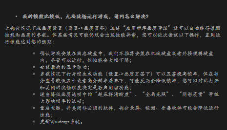 大部分情况下基本上都是游戏画质设置的问题,玩家可以进入游戏,摁【Esc】切出【设置】-【画质页签】-【应用推荐画质等级】,这样就能获得兼顾性能和画质的参数。(注:某一些情况下会出现性能异常,玩家可以尝试以下的操作,到达你满意的性能和出色的画质流畅度)
