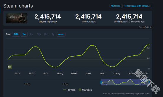 根据SteamDB数据显示,黑神话悟空叒刷新了自己的新纪录,在线人数来到240多万人,已经突破了之前的235万人的纪录,随着发售后第一个周末的到来,看这个样子,这个纪录有希望在明后两天的周末继续刷新峰值。