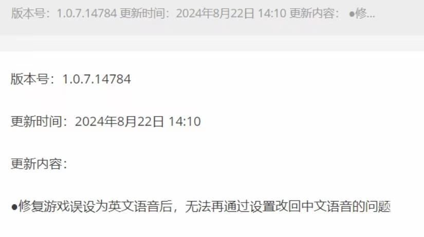 就在昨天,黑神话悟空官方发布了v.1.0.7.14784 版本补丁,主要修复了玩家将游戏设为英文语音后,无法再通过设置改回中文语音的问题。