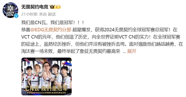 不久前无畏契约2024全球冠军赛结束,edg获无畏契约2024全球冠军赛冠军,这是cn赛区新的里程碑。