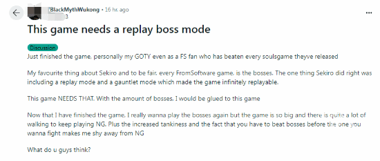 近日,有黑神话悟空玩家发帖表示,希望黑神话悟空加入比较有意思的boss挑战模式。这名玩家表示他已经通关,但是非常想玩二周目,但是流程实在是太长了,需要走很长的路才能打到你想要的boss,目前都不敢开启二周目的挑战,但是有了boss挑战模式,会更加沉迷于这款游戏的。