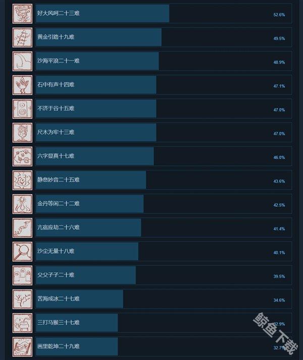 此外当玩家击败第二关的boss就能解锁好大风呵二十三难这一成就的人只有47.9%的玩家,那么就意味着steam平台上有一半多的玩家还没有通过第二关。