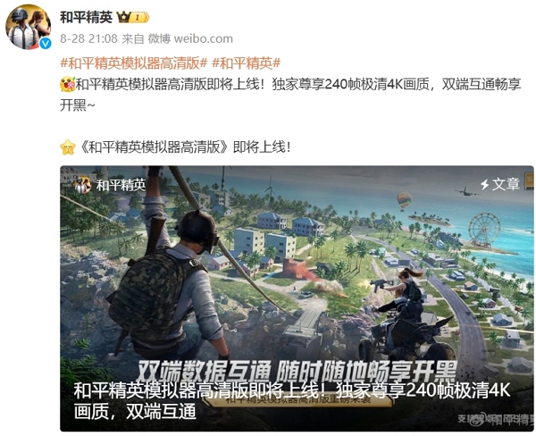 和平精英在不久前正式宣布,游戏即将上线模拟器,模拟器为高清版本,拥有240帧超高帧数。