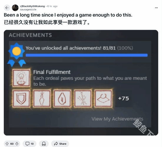 黑神话悟空已经上线了快2周的时间了,很多玩家都开始陆陆续续的通关和开始刷一周目和二周目了,不过也有不少的玩家是为了完成steam的成就的。目前就有国外的网友晒出自己的steam全成就的截图,并表示已经很久没有享受过一款游戏了。