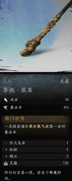 黑神话悟空兽棍熊罴怎么样?作为一款上品武器,也是受到了很多玩家的喜爱,具有不错的暴击率的提升和攻击力的加持,今天就为玩家们带来了关于这个武器的一些资料图鉴,帮助玩家来更好的体验接下来的内容。