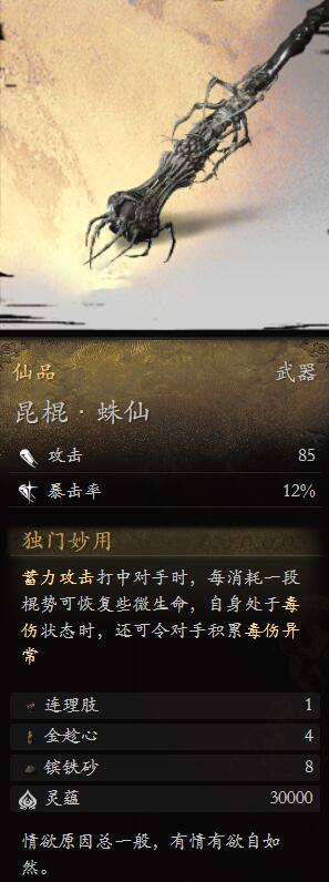 黑神话悟空昆棍蛛仙怎么样?蓄力攻击打中对手时,每消耗一段棍势可恢复些微生命,自身处于毒伤状态时,还可令对手积累毒伤异常,是一个仙品级别的武器,玩家能够通过锻造获取到这款昆棍蛛仙。